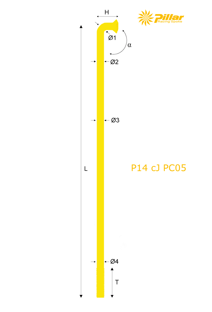 Pillar Spoke – RADIO INOX REDONDO, ACODADO AMARILLO | J-Bend Round, Yellow Inox Spoke. P14, Color PC-05. 2,0mm. 80-280mm.