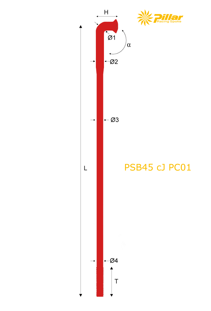Pillar Spoke – RADIO INOX REDONDO CONIFICADO SIMPLE, ACODADO ROJO | Single-Butted J-Bend Round, Red Inox Spoke. PSB45, Color PC-01. 2,0-1,8mm. 80-270mm.