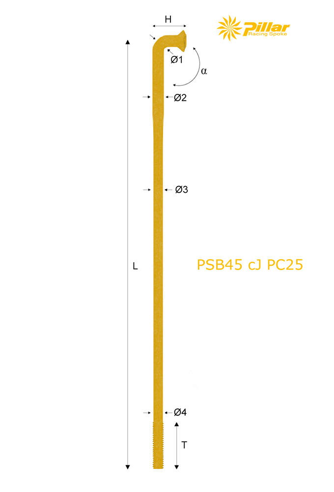 Pillar Spoke – RADIO INOX REDONDO CONIFICADO SIMPLE, ACODADO ORO PURPURINA | Single-Butted J-Bend Round, Glitter Gold Inox Spoke. PSB45, Color PC-25. 2,0-1,8mm. 271-310mm.