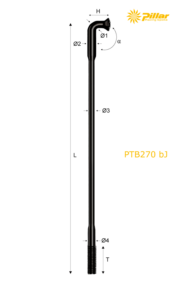 Pillar Spoke – RADIO INOX REDONDO TRIPLE CONIFICADO, ACODADO NEGRO | Triple-Butted Round, J-Bend Black Inox Spoke. PTB270. 2,2-1,7-2,0mm. 259mm
