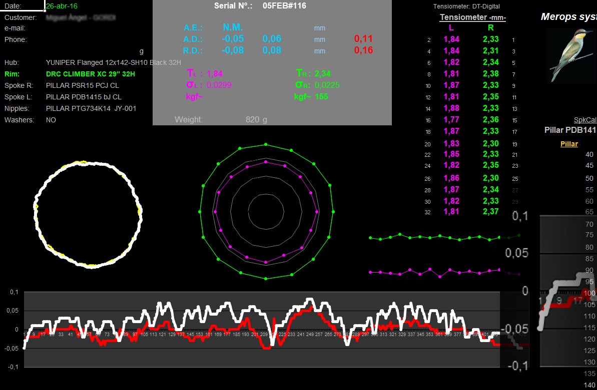 Cuando la rueda alcance un punto tal que la llanta no me permita incrementar más la tensión promedio sin poder reducir el valor de las desviaciones estándar de la tensión, consiguiendo reducir al mínimo posible las tolerancias de las desviaciones de alineación tras ser sometida a un proceso exigente de estabilizado, será entonces cuando esté lista para ser disfrutada por el cliente, no sin antes proceder al registro de todos los parámetros de salida indicados al principio. Este proceso requiere de un tiempo considerable a pesar de ser semiatuomatizado dada la complejidad de los valores registrados. Estos datos serán el “DNI” de su rueda, fiel reflejo de la labor realizada sin manipulación ni palabrería, llegando a poder poner en evidencia cualquier imperfección. Es como pasar cada rueda por una “máquina de la verdad” y tener los resultados de ello al comprarla.